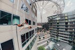 - Blick auf den DB Tower und die ikonische Dachkonstruktion