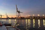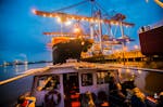 Containerschiffe, deren Lichter sich im Wasser der Elbe