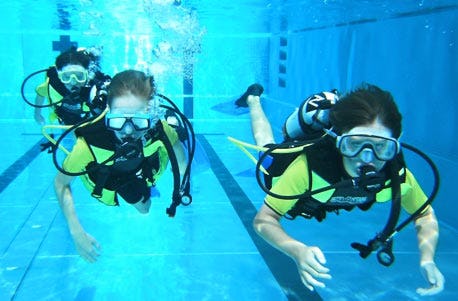 Spielerisch erleben die Nachwuchstaucher im Pool den Schwebezustand unter Wasser und erlernen die